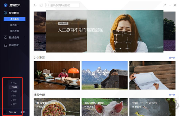 2、此時會顯示時間和類型,切換時間可更改范圍為:3分鐘、10分鐘、30分鐘、1小時、2小時、3小時。壁紙類型可更改范圍為:我收藏的壁紙、為我推薦。