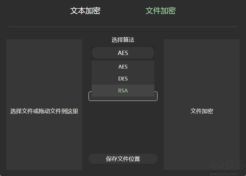 3、直接將文件拖拽到軟件界面中,提供多種算法加密方式,如 “AES、RSA 等。選擇適合的加密方式,并根據(jù)需要設(shè)置密碼;