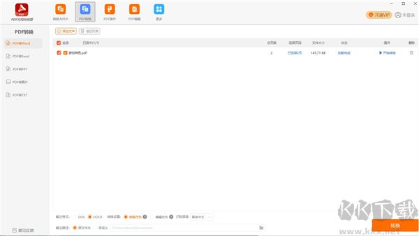 3、點擊pdf轉換菜單,選擇目標格式(如Word、Excel、PPT、圖片等),設置輸出選項后點擊“開始轉換”將PDF導出為其他文件;也可將其他文件拖入軟件直接轉換為PDF。