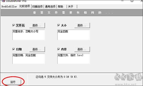 2、在“比較選項”里選擇對比方式(文件名、大小、日期或內(nèi)容),點“運行”開始查找。