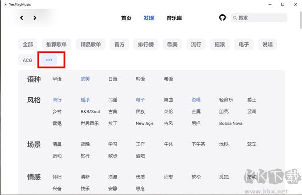 2、這里點擊三點就可以看到很多類型的音樂了,有不同語種,風(fēng)格、場景、情感等幾大分類