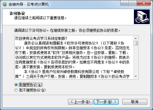 1.將kkx分享的云考點(diǎn)壓縮包解壓一下,打開(kāi)安裝程序,(安裝向?qū)⒃谀愕碾娔X上安裝云考點(diǎn)計(jì)算機(jī)版本。)點(diǎn)擊下一步繼續(xù)安裝