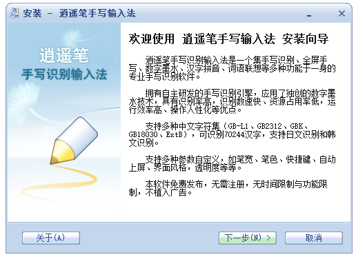 在kkx分享的地址獲取到逍遙筆輸入法的亞歐哦寶解壓出來,雙擊.exe文件,歡迎使用逍遙筆手寫輸入法安裝向?qū)В?/p>