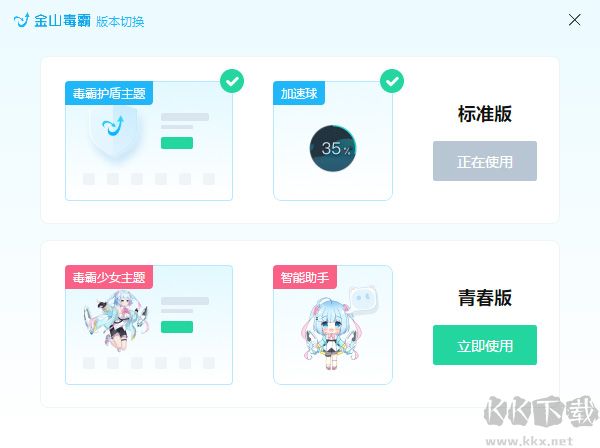 金山毒霸是為年輕群體打造,不僅提供豐富的二次元、3D萌系主題壁紙,界面清爽、運(yùn)行高效等優(yōu)勢(shì),更特別加入了游戲加速模式,讓玩家享受更順暢的游戲體驗(yàn)。擁有多項(xiàng)業(yè)界領(lǐng)先的防護(hù)技術(shù),包括啟發(fā)式掃描、代碼深度解析、虛擬環(huán)境查毒等,在病毒查殺范圍、掃描速度、未知威脅防御等方面表現(xiàn)優(yōu)異。同時(shí)具備實(shí)時(shí)防護(hù)墻、壓縮包病毒檢測(cè)、郵件病毒攔截等實(shí)用功能,全方位守護(hù)您的電腦安全。需要的朋友快來下載試試吧!一定可以讓你滿意。