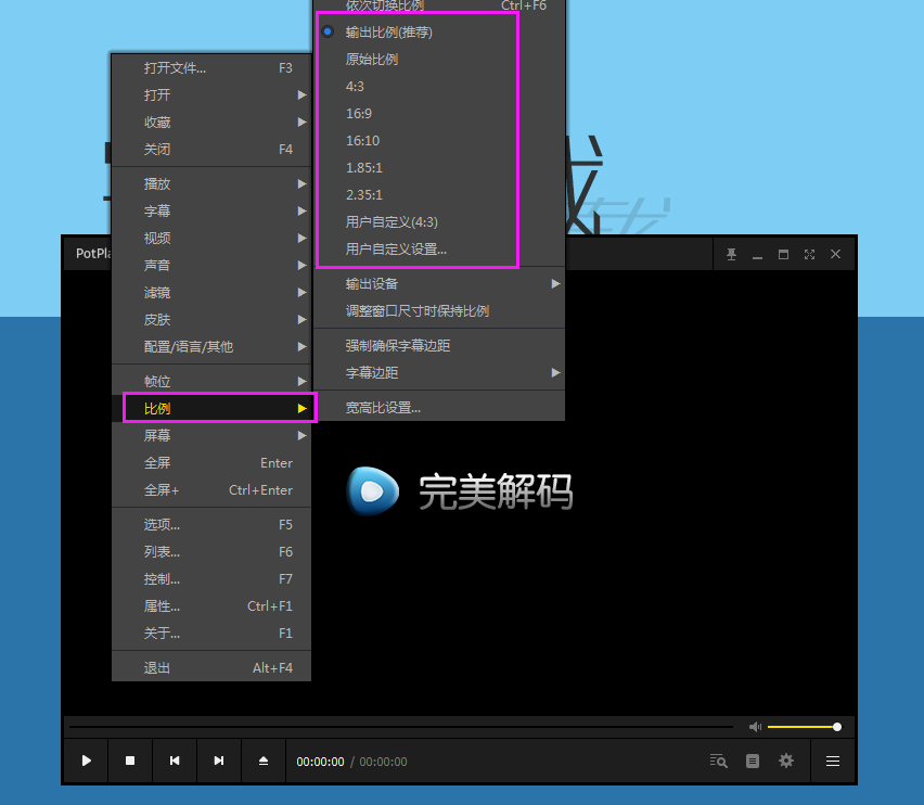 有些用戶反映:在窗口模式播放的時候,視頻不是鋪滿窗口的,這個顯示比例該怎么設(shè)置?這個問題其實也很簡單,具體操作為:界面上右擊調(diào)出設(shè)置菜單→比例→選擇你所想要的比例