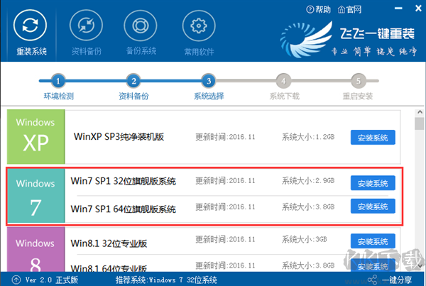 3、到達(dá)系統(tǒng)選擇界面,飛飛一鍵重裝精選了好用的操作系統(tǒng),選擇自己需要安裝的操作系統(tǒng)版本、位數(shù),點(diǎn)【安裝系統(tǒng)】;