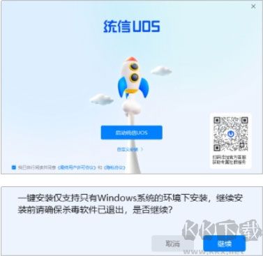 2、單擊 【啟動統(tǒng)信UOS】。確認電腦是否只安裝了Windows,無其他操作系統(tǒng),確認無誤單擊【繼續(xù)】。