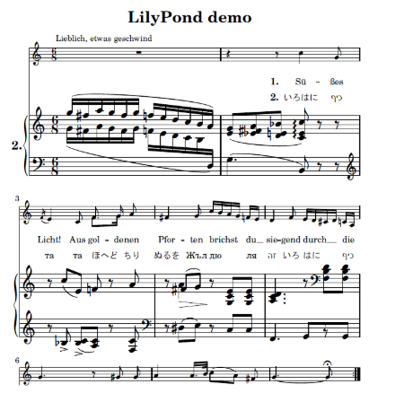 將音樂(lè)精彩片段放進(jìn)文本中,不用裁切和黏貼照片。將音樂(lè)融合到LaTeX或HTML中,或是應(yīng)用OOoLilyPond將音樂(lè)加上到OpenOffice.org。軟件也可用以容許LilyPond編碼在各種各樣blog和維基百科,使在線協(xié)作變成很有可能。