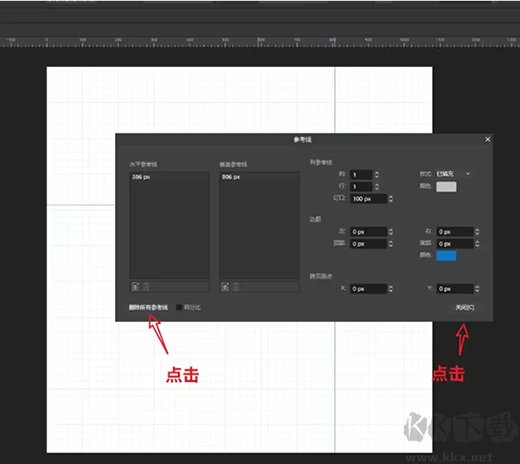 3、在彈出的窗口中,點擊“清除所有參考線”,并點擊“關(guān)閉”按鈕,即可完成參考線的清除。