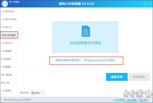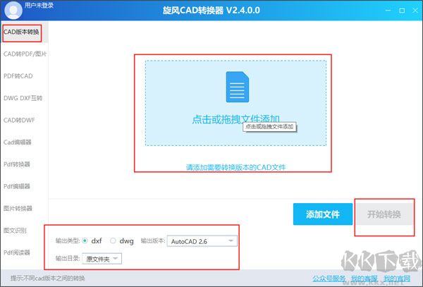 打開(kāi)軟件之后,用鼠標(biāo)靠近“點(diǎn)擊或拖拽文件添加”,選擇好需要換貨版本的CAD文件。選擇好之后,設(shè)置左下方的輸出類型、輸出版本以及輸出目錄,最后點(diǎn)擊開(kāi)始轉(zhuǎn)換。