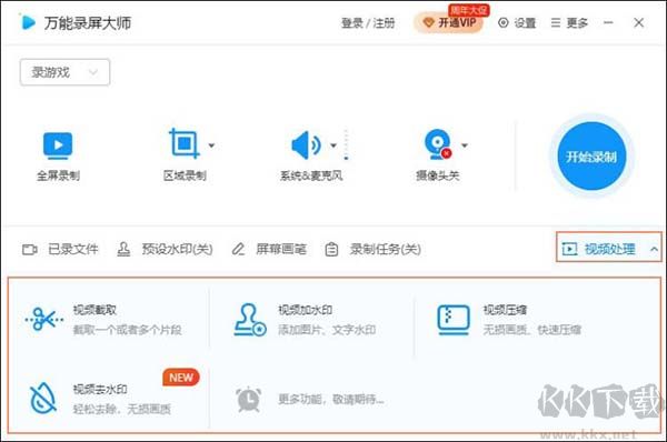 游戲錄制結(jié)束后,可以點擊【視頻處理】按鈕進行各種視頻編輯操作。