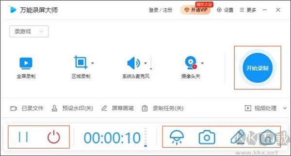 點擊【開始錄制】按鈕開始游戲的錄制,懸浮窗口提供【暫停錄制】、【結(jié)束錄制】、【聚光燈】、【截圖】、【屏幕畫筆】以及【主窗口】等功能按鈕。