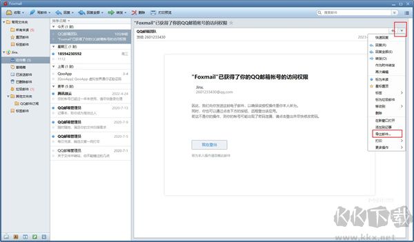 2、郵件的右上方點(diǎn)擊倒三角圖標(biāo),其中就有導(dǎo)出郵件選項(xiàng)。