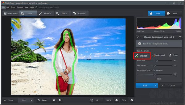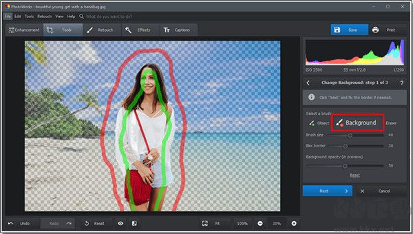 該程序?qū)⒆屇褂镁G色畫筆在前景上標(biāo)記對(duì)象。調(diào)整畫筆大小并標(biāo)記對(duì)象或人。你不必仔細(xì)地把所有東西都涂上。只需畫幾筆,PhotoWorks 就會(huì)自動(dòng)確定邊緣