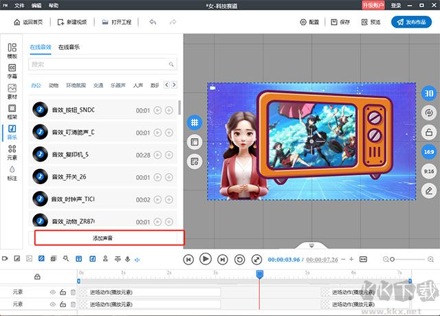 支持導(dǎo)入音頻或現(xiàn)場錄音,雙擊音頻軌道可進行剪輯操作,包括截取片段、靜音處理、音頻拆分與合并,并可添加機器人、變形金剛、消音效果、宇航員、童聲等趣味音效。