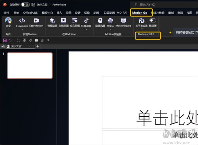 安裝結(jié)束后,即可點擊“立即打開”就會啟動PPT程序,然后你在頂部選項卡就可以看到“MotionGo”了。