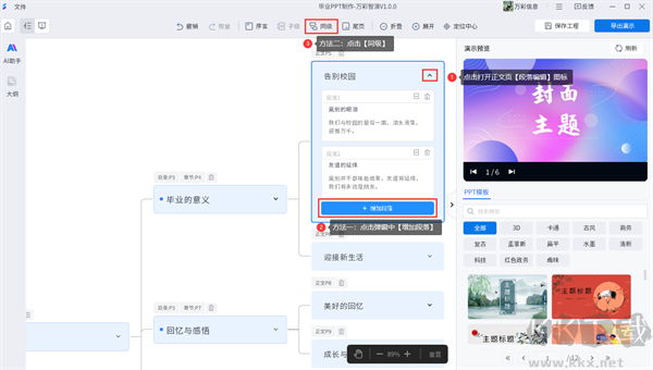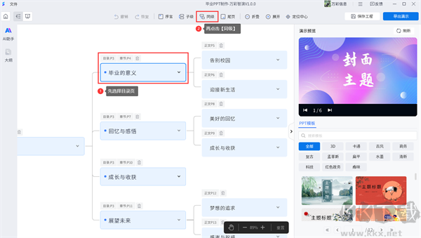 除了傳統(tǒng)的文本模式PPT,還支持以思維導(dǎo)圖的形式展現(xiàn)智能生成的PPT內(nèi)容,迅速關(guān)聯(lián)PPT的關(guān)鍵點(diǎn)和創(chuàng)意想法,快速構(gòu)建清晰的PPT思維導(dǎo)圖。這種方式比手動制作更加高效,非常適合忙碌的職場人士使用。
