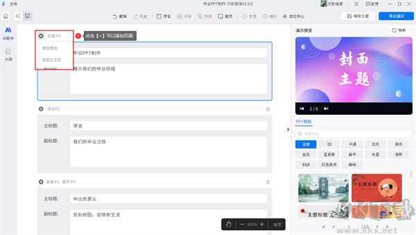 集成萬彩AI,只需提供核心內(nèi)容與關(guān)鍵詞,即可一鍵生成符合要求的完整PPT內(nèi)容。 • 利用AI技術(shù)簡化PPT制作流程,大幅節(jié)省時間。