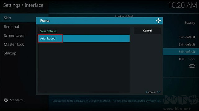 2、點擊Interface,選擇Skin并點擊Fonts,將字體改為Arialbased(此步驟是顯示中文的關(guān)鍵,否則可能出現(xiàn)亂碼)