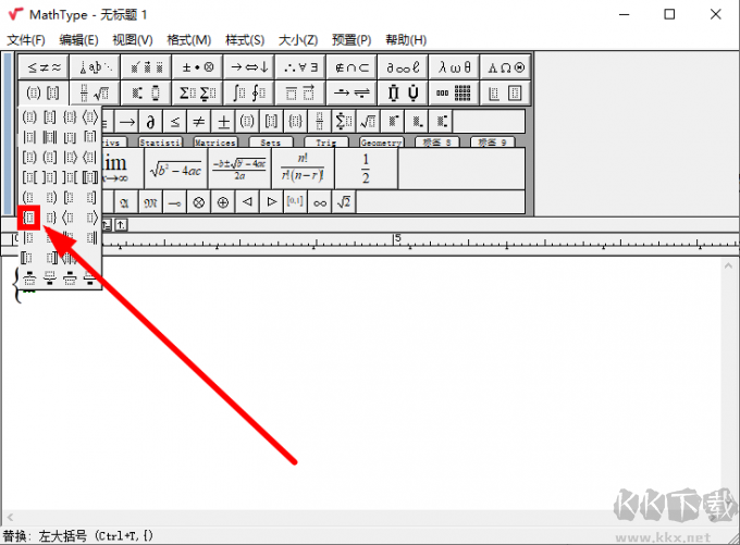 1、打開mathtype,點擊第二行第一個括號分割符,會出現(xiàn)一個符號列表,其中紅色箭頭所示的位置是左大括號。