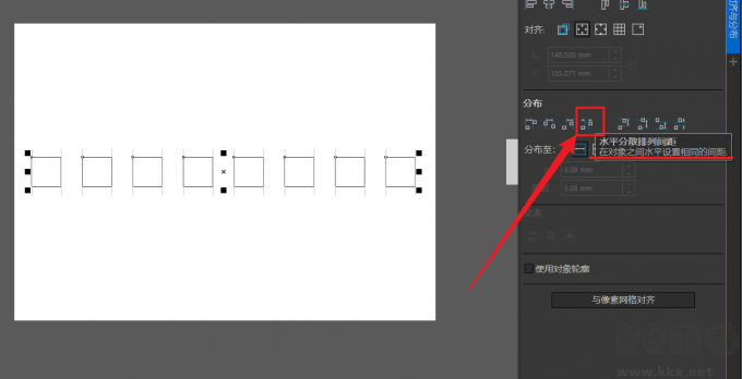 3、將對象保持為選中狀態(tài),隨后點(diǎn)擊“對齊與分布”泊塢窗中“水平分散排布間距”功能,使用后可以發(fā)現(xiàn),正方形之間的間距變得一致,且沿水平軸方向均勻分布。