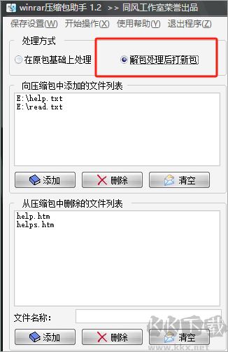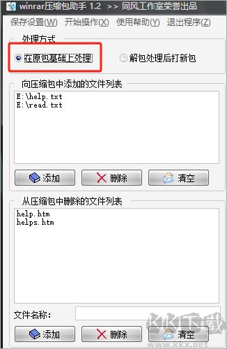 “在原包基礎(chǔ)上處理”是指不解開原壓縮包,直接在此基礎(chǔ)上進行添加,刪除交件的操作。它的優(yōu)點是速度快,缺點是只能刪除根目錄下的文件。