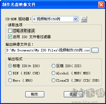 2、可以設(shè)定UltraISO的讀取選項:忽略讀取錯誤,啟用ISO文件卷過濾器;指定輸出映像文件名及路徑。選擇映像文件的輸出格式,UltraISO支持多種輸出格式,在這里選擇標(biāo)準(zhǔn)ISO格式(*.iso)。點擊“制作”按鈕,進(jìn)入ISO映像制作過程。