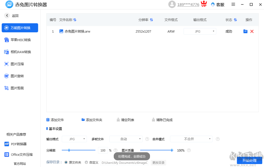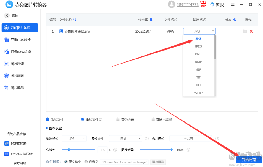 3、文件添加進(jìn)來(lái)之后,我們看右邊的——輸出格式——這里可以選擇我們需要轉(zhuǎn)換的格式,這里我們需要轉(zhuǎn)換arw轉(zhuǎn)jpg的,所以我們默認(rèn)選jpg這個(gè)格式。如何點(diǎn)擊右下角的——開(kāi)始處理——這個(gè)按鈕。