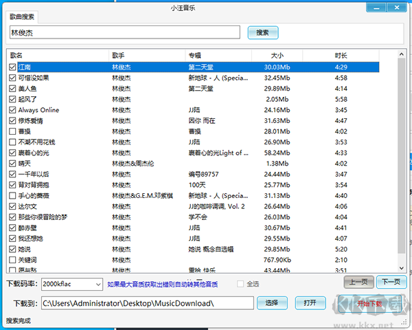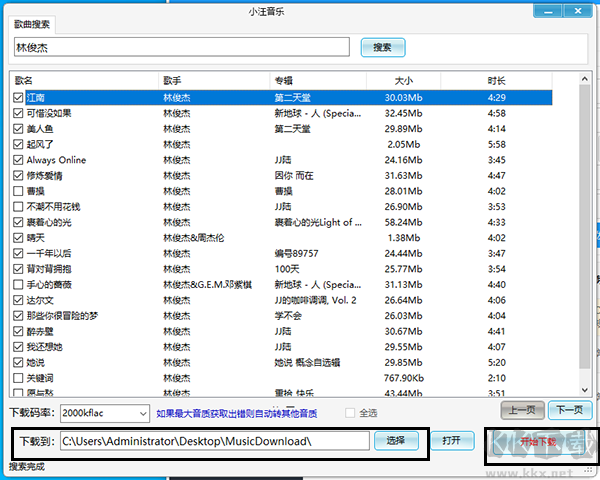 PC版不提供試聽功能,但支持多首歌曲同時下載。先設定好保存路徑,再勾選需要獲取的曲目,點擊下方“開始下載”即可。下載速度較快,短暫等待便可完成,軟件會一并獲取封面、歌詞和音頻文件。