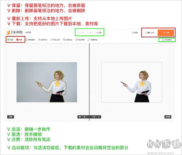 3、操作其實很簡單,主要用到兩個畫筆:保留畫筆:涂在想要摳出的部分(比如人物),刪除畫筆:涂在要去掉的背景上。