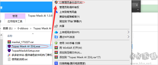 3、裝好之后回到解壓的文件夾,找到"Topaz Mask AI 漢化.exe"這個(gè)文件,同樣右鍵用管理員權(quán)限運(yùn)行它。