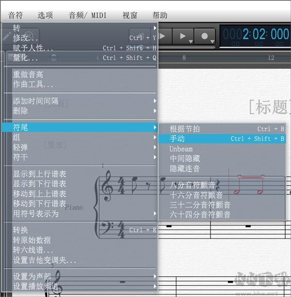 打開軟件后,點擊頂部菜單欄的【音符】→【符尾】→選擇【手動】(快捷鍵 Ctrl+Shift+B),即可自由調整符尾樣式。
