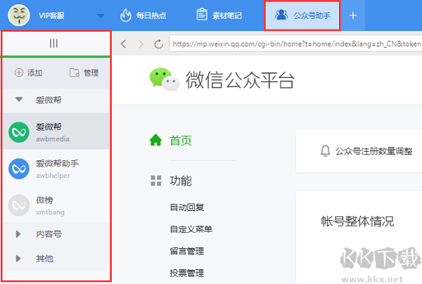 愛微幫電腦助手是一款針對(duì)微信開發(fā)的軟件,通過它用戶可以進(jìn)行微信多賬號(hào)登錄、管理多個(gè)公眾號(hào)、快速發(fā)表文章、自動(dòng)推送信息等多項(xiàng)操作,幫助用戶進(jìn)行有效管理,非常適合從事微信媒體推廣的用戶。