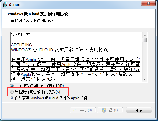 1.從kkx分享的地址獲取到安裝包,打開安裝程序,Windows版iCloud及擴展許可協(xié)議