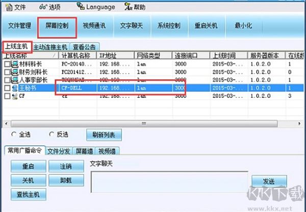 3、需要控制對方時,首先選中你想控制的用戶,該被控端狀態(tài)顏色變藍,說明被選中了,如下圖。然后點擊工具欄上相應(yīng)的功能按鍵,即可對該被控端實施控制。