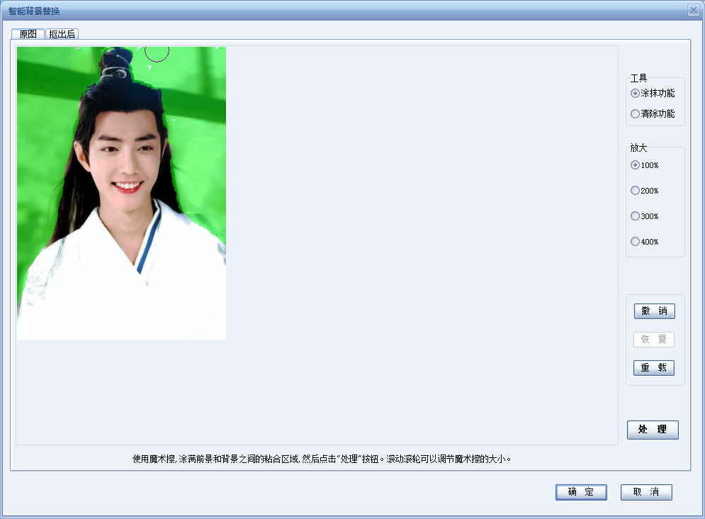 第四步、替換背景。點(diǎn)擊【背景處理】,利用對(duì)話框中的涂抹功能和清除功能,替換背景顏色或者背景圖片。