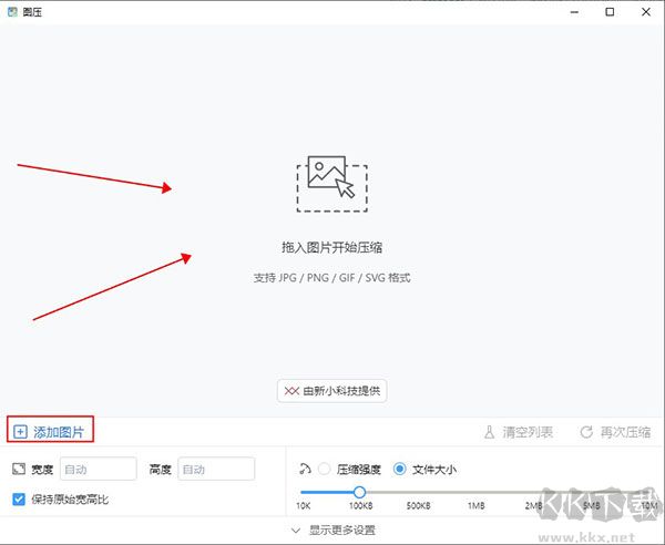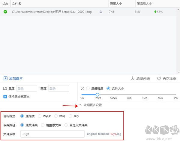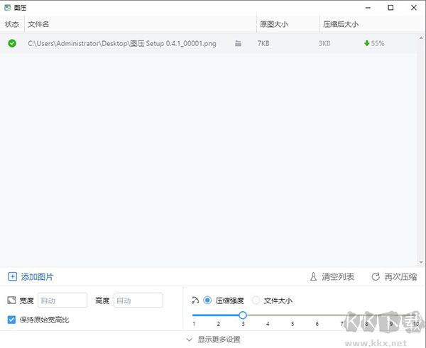 5、軟件下方區(qū)域可以對圖片壓縮后的長寬和壓縮強(qiáng)度、文件大小進(jìn)行設(shè)置。
