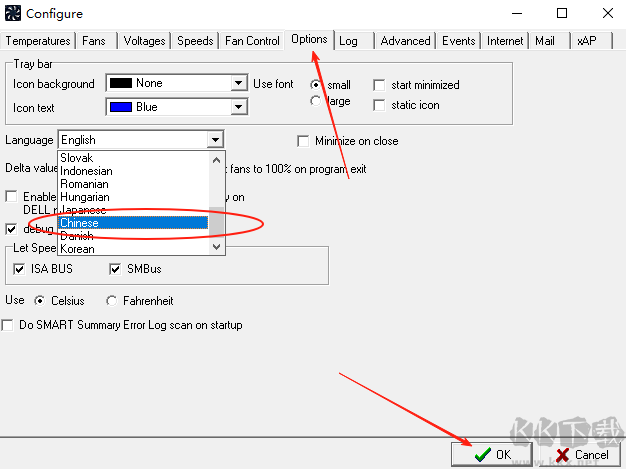 2、在新窗口中點(diǎn)擊“Options”進(jìn)入選項(xiàng)設(shè)置,“language”處即為語(yǔ)言設(shè)置,在下拉中找到倒數(shù)第三個(gè)“Chinese”即可