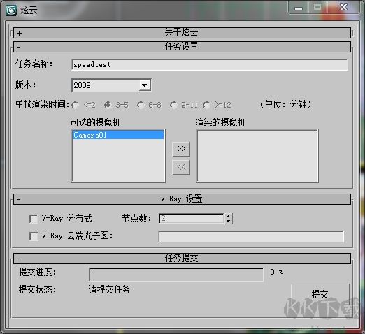 4、運行3dsMax軟件,例如Max 2009。在"文件"菜單中打開渲染設(shè)置對話框,設(shè)置渲染結(jié)果保存路徑,然后,在“渲染”菜單=> “炫云”菜單項,出現(xiàn)如下圖所示的“炫云”對話框,單擊“提交”按鈕即可。