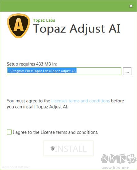 2、雙擊Topaz Adjust AI.exe,選擇目錄,同意條款,點(diǎn)擊install安裝