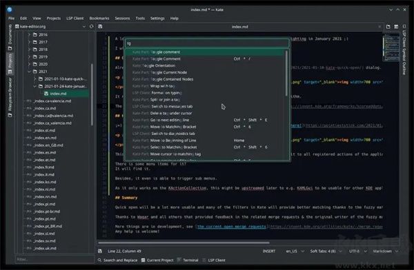 快速打開功能是Kate一直以來都有的一項(xiàng)功能,在過去的一段時(shí)間,這一功能并沒有得到太多改進(jìn)?,F(xiàn)在,隨著新的21.04版本的發(fā)布,這一功能發(fā)生了質(zhì)的改變,包括模糊匹配以及一些新的UI。