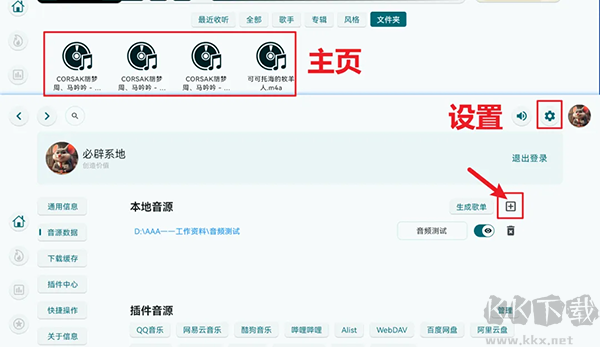 2、在右上角的設(shè)置里,打開音源數(shù)據(jù),你可以通過旁邊的“+”圖標(biāo)添加本地音樂文件,添加完后,主頁里就會(huì)顯示本地音樂了。