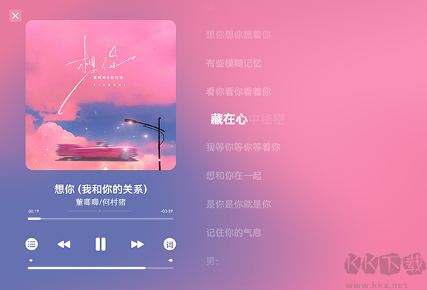 3、音樂播放界面也很精美,看起來就很舒適,歌詞、封面等基礎(chǔ)功能都有。