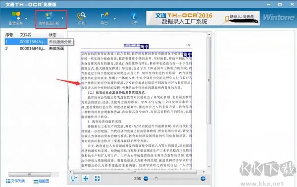 3、點(diǎn)擊簡(jiǎn)單版面分析,軟件會(huì)自動(dòng)文字定位,在整幅圖像上尋找文字進(jìn)行定位。