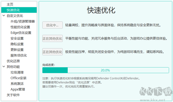 支持手動勾選優(yōu)化項目,覆蓋系統性能、后臺服務、隱私設置、瀏覽器配置等多個方面,按需調整。