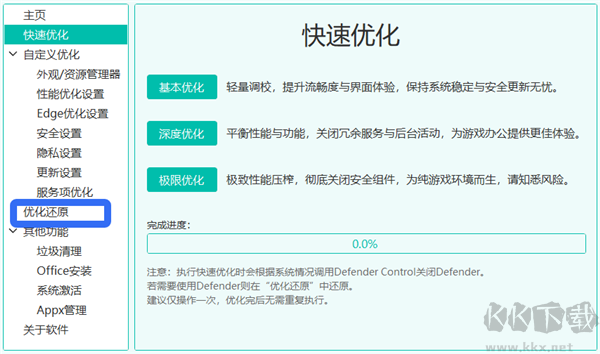 提供恢復功能,可一鍵撤回優(yōu)化操作,防止誤改設置導致的系統異常。