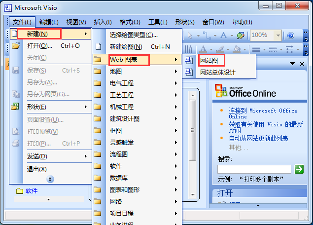 1.打開Visio 2003,點擊新建,選擇【新建】——【W(wǎng)eb 圖標】——【網(wǎng)站圖】