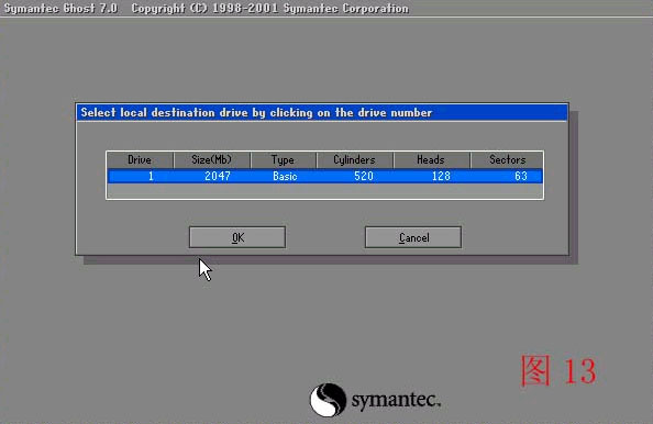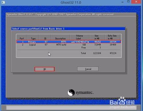 5、再接下來就是選擇分區(qū),也就是你要備份的本地磁盤,下面只有兩個分區(qū),默認(rèn)第一選項為主分區(qū),即C盤,也就是你的系統(tǒng)所在分區(qū),選擇后使用TAB鍵切換到OK,回車;