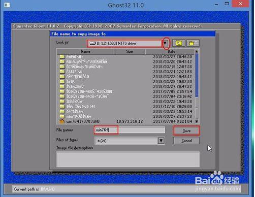 6、接來就出現(xiàn)文件瀏覽界面,也就是我們選擇備份要保存的位置,還有備份文件名了。備份不能選系統(tǒng)所在分區(qū)。然后在“File name”一欄輸入文件名(如Win764),點(diǎn)擊 “Save”,保存;