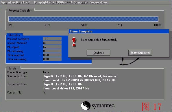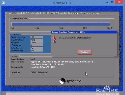 9、備份到100%表示備份完成,點(diǎn)擊Continue 繼續(xù);